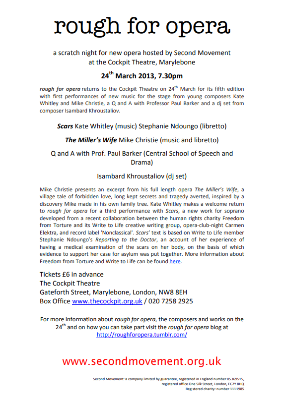 Scars, which is based on Reporting to the Doctor by Stephanie Ndoungo, came out of a collaboration that took place in December 2012 between the Human Rights Charity Freedom From Torture, opera-club-night Carmen Elektra, and record label ‘Nonclassical’. Members of Freedom From Torture’s creative writing group ‘Write To Life’, which provides Freedom From Torture’s clients with a creative outlet for their experiences and a way to explore the torture from their past and the difficulties of living in exile, were paired with composers from Carmen Elektra Opera Collective; Scars came out of that collaboration. The text is based on Stephanie’s account of her experience of having a medical examination of the scars on her body, on the basis of which evidence to support her case for asylum was put together.