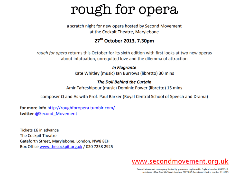 The Doll Behind the Curtain (scenes, 20 mins) Amir Mahyar Tafreshipour (music) Dominic Power (libretto) after the short story of the same name by Sadegh Hedayat) Maya Sapone (director) Andy Armistead (bass) Oliver Brignall (tenor) David Jones (baritone) Barbara Walton (soprano) Ruby Aspinall (harp) Mary Dullea (piano) Amir Mahyar Tafreshipour (musical director) PROGRAMME NOTE My opera The Doll behind the Curtain is a modern operatic staged adaptation of Sadegh Hedayat’s short story of the same title. It is an intense, imaginative story of a young man’s fascination for a silent statue behind a boutique window. Captivated by her mysterious beauty, he carries the statue back to Iran, where his infatuation and inner conflict leads him to an act which will destroy his own life and the life of his fiancée who has struggled to compete with her silent rival. Since 2009 I have researched for a short operatic plot which was felicitous for staging. After consulting with different scholars I was very much intrigued by this short story which is very considerable in length and complexity, portraying sequential characters and adaptable for my chamber opera. This opera will explore the complexity of love, sexuality and intimacy from the perspective of the main character torn between tradition and modernity. The libretto and scenario is written by Dominic Power (Head of Screen Arts – National Film and Television School and a librettist for both opera and theatre). BIOGS ANDY ARMISTEAD (bass) Discovered in late 2012, while auditioning for the Bournemouth Symphony Chorus, Andy was referred by the BSC to his first teacher Lynton Atkinson. Together they have worked intensively to develop his technique and range. Just one year after his first lessons, Andy had begun studying as a post-graduate at the Trinity Laban Conservatoire of Music and Dance and is now engaged in several professional projects alongside that study, recently playing Osmin in Die Entführung aus dem Serail and soon to play Il Commendatore in Don Giovanni. Follow Andy’s career at http://www.facebook.com/Andy.Armistead.Bass OLIVER BRIGNALL (tenor) is both a singer and composer. He is currently studying for a PhD in composition at Brunel University under the supervision of Dr John Croft and Professor Peter Wiegold. He has been involved in ‘Blue Touch Paper’ with the London Sinfonietta and had music performed at the Sounds New festival. This year, he was a Britten-Pears young artist at the Aldeburgh Festival. Roles include; Mr Upfold the Mayor in Albert Herring (MWO), Mr Porcupine in The Fantastic Mr Fox (Picker) (OHP), Gastone La Traviata, Orestes La Belle Helene (Merry Opera) and covers of Monsieur Triquet Yevgeny Onegin and Frederico l’Amico Fritz (Mascagni) (OHP). He is a passionate performer of new music, most recently creating the role of Melvyn Bragg in The Francis Bacon Opera (Crowe) (Edinburgh Fringe ’12) and has appeared frequently at the ‘Grimeborn’ and ‘Tete a Tete’ opera festivals. Upcoming Concert of new English songs (Aldeburgh/Institute of Composing), …and trees would sing (Padjing) The Riot Ensemble, Harry La Fanciulla del West (OHP), Ensemble L’Orfeo (Munich Bayerische Staatsoper) and the world premier of a work commissioned specially for the 2014 Dublin Arts Festival. DAVID JONES (baritone) A baritone and actor of rare versatility, David Jones has been acclaimed in work ranging from the title role in Shakespeare’s Hamlet to Gilbert and Sullivan operettas. Recent highlights have included singing Ruprecht in a reconstruction of part of Prokofiev’s The Fiery Angel, playing Ko-Ko in a new production of The Mikado for Co-Opera Co., and singing with Dame Felicity Lott. He has a strong interest in new music and created the roles of Jamie in The Sleeper with Welsh National Youth Opera, James in These Things Happen at the Courtyard Theatre and Hilarianus in Nick Bicât’s cantata, Perpetua, at Christ Church Cathedral, Oxford. Forthcoming engagements include Schubert’s Die Schöne Müllerin in Paris and London. MAYA SAPONE (director) A versatile artist with exceptional vocal flexibility and improvisational skills, opera singer Maya Sapone performs both in the UK and internationally. Creative associate and permanent member of award-winning company Elastic Theatre, Maya’s area of activity ranges from performing in operas, musicals and experimental theatre to stage directing as well as teaching. As a director she has worked extensively with people coming from a disadvantaged background using opera as a medium for positive change. Maya starred to great critical acclaim in the role of Lady Thiang in the No. 1 UK Tour of the Rodgers & Hammerstein musical THE KING AND I directed by Paul Kerryson. Recent credits include the role of The Teacher in Elastic Theatre’s multi-media film project, Julius, which is currently being presented at various arts and multimedia festivals both in the UK and Europe. http://www.MayaSapone.co.uk AMIR MAHYAR TAFRESHIPOUR (composer) received his BMus from the Esbjerg Academy of Music (Denmark) in piano and pedagogy in 2001 and a BMus in composition at Trinity College of Music (London) in 2003. In 2004 he gained his MA in composition at the Guildhall School of Music and Drama (London) and his PHD in Chamber Opera and Composition from the Brunel University in London (2013). Amir Mahyar is an award winning composer, gaining first prize at the Biennial Competition for New Music at Tehran University for his solo Piano piece and also a silver medal for outstanding achievement at Trinity College of Music, presented by the Duke of Kent in 2003. At the Counterpoint Competition held in New York, he was a prize winner for his Solo Flute composition. His works have been commissioned and performed by Soloists, Ensembles and Orchestras including Tomoko Sugavara, the Clarinet Ensemble of the Victoria University, Anadolu Symphony Orchestra and “In Corpore” String Quartet. In 2005, he was